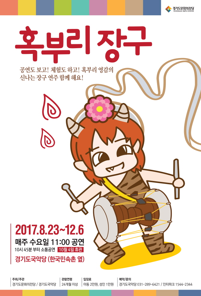 - 공연도 보고, 체험도 하고, 경기도 국악당에서 국악여행의 세계로경기도문화의전당 국악당(사장 정재훈)에서 오는 8월 23일부터 매주 수요일마다 어린이를 위한 전통연희극 <혹부리 장구>를 선보인다. 신명나는 연주와 실감나는 연기로 국악 장단과 장구의 색다른 조화와 매력을 느낄 수 있는 국악공연이다.