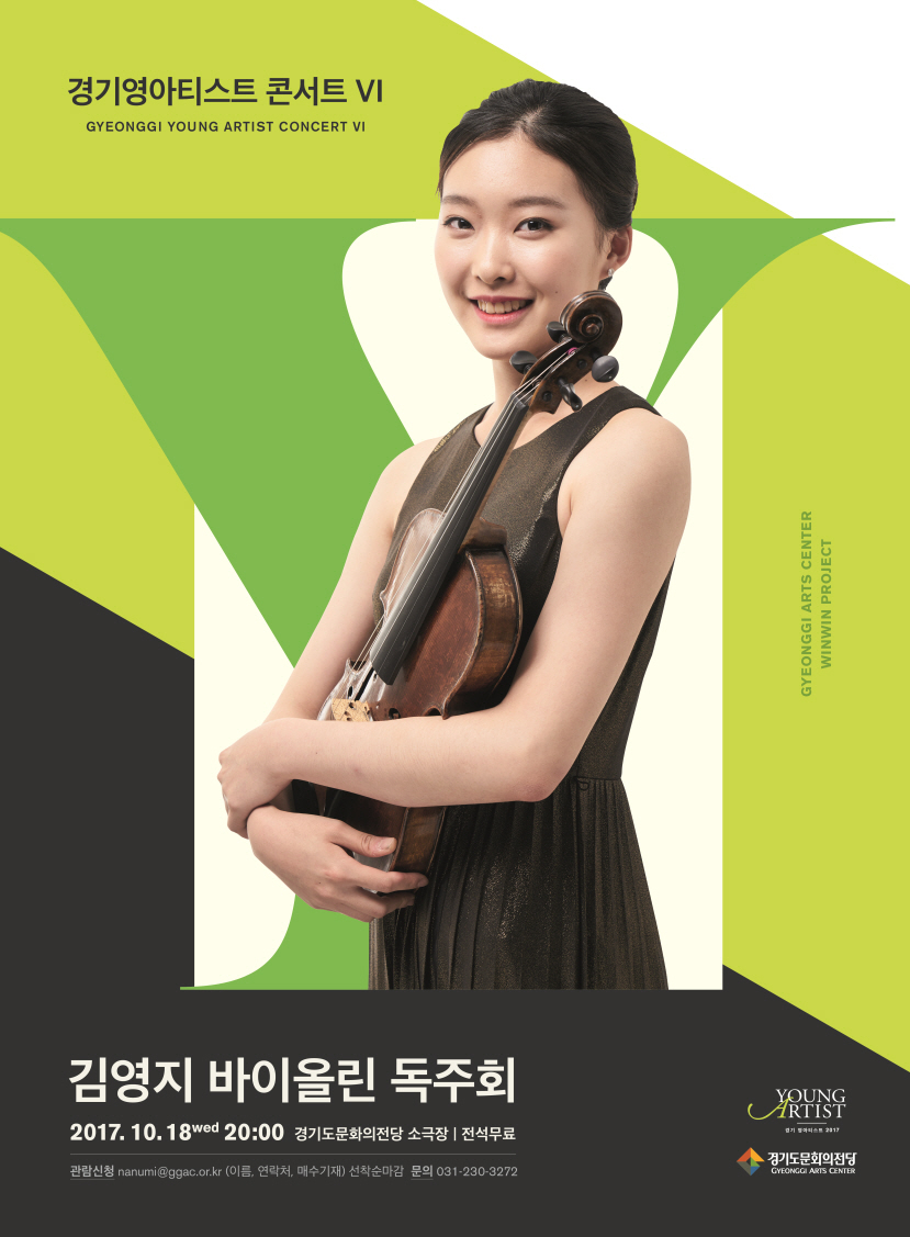 서울대학교 관현악과에 재학 중인 김영지는 제23회 KBS·한전 음악콩쿠르 1위, 제42회 중앙음악콩쿠르 2위, 2016 저스트 비바체 페스티벌 콩쿠르 1위, 서울대학교 필하모닉 오케스트라 악장(2016), 금호 영아티스트 독주회(2017)의 화려한 이력을 가진 재원이다. 10월에 열릴 <2017 경기영아티스트 콘서트 Ⅵ - 김영지 바이올린 독주회>에서는 바흐의 '바이올린 소나타 제1번 G단조'의 '아다지오'와 '푸가', 베토벤의'바이올린 소나타 제7번 C단조 작품 30-2', 파가니니의 '바이올린 독주를 위한 카프리스 작품 1 중 5번', 네드 로렘의 '가을 음악', 왁스만의 '카르멘 환상곡'등을 연주한다. 김영지는 “경기영아티스트에 선발되어 독주회를 준비하며 매순간 음악을 진지하게 대하고 연구해야 한다는 것을 더욱 느끼게 되었다”고 소감을 밝혔다. 또한 “이번 독주회에서 바흐부터 현대곡까지 넓은 범위의 곡을 선보이고자 한다”며 “관객들이 바로크에서 현대에 이르는 음악의 흐름을 재미있게 감상할 수 있는 무대를 만들겠다”는 포부를 전했다.