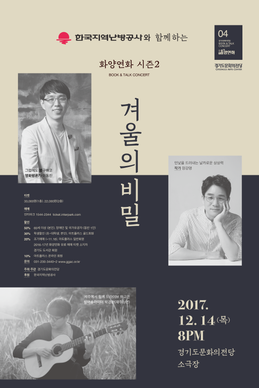 - 영화평론가 이동진, 작가 장강명, 재주소년 박경환 함께 해책과 음악이 있는 북콘서트 <話양연화 시즌2 : 겨울의 비밀>이 14일 경기도문화의전당(사장 정재훈) 소극장에서 관객들을 마주한다. 2017년 <話양연화 시즌2>는 계절마다 '거짓말', '실수', '오해' 등 인간의 무의식과 본능에서 비롯된 아찔한 단어들을 주제로 허심탄회한 대화를 나눠왔다. 마지막 겨울 공연이 선택한 주제는 '비밀'. 영화평론가 이동진이 여전히 안방을 지킨다.
