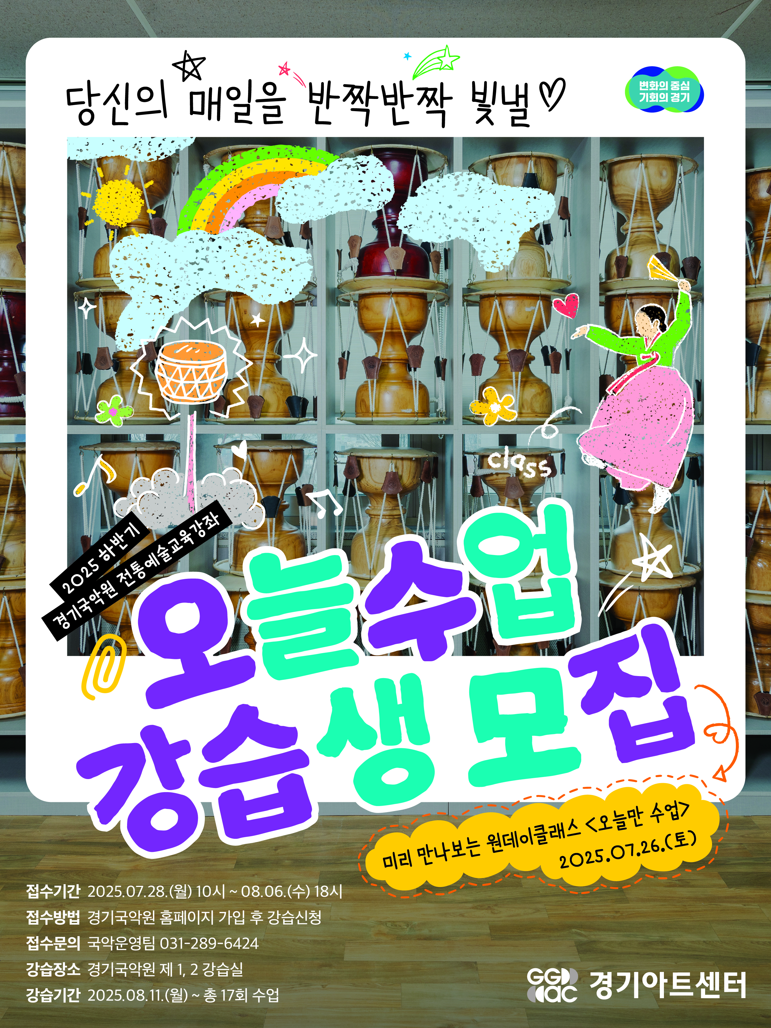 경기아트센터 경기국악원(사장 김상회)이 하반기 전통예술교육강좌 <오늘수업>을 개강을 앞두고 8월 6일(수)까지 강습생을 모집한다. <오늘수업>은 경기국악원이 개관한 2004년부터 시작되어 지금까지 꾸준히 사랑받고 있는 국악 기반 예술교육 프로그램이다. 국가무형유산 이수자, 문화예술교육사, 교원 자격 등을 갖춘 강사진들이 전문적인 국악 실기 교육을 진행한다.