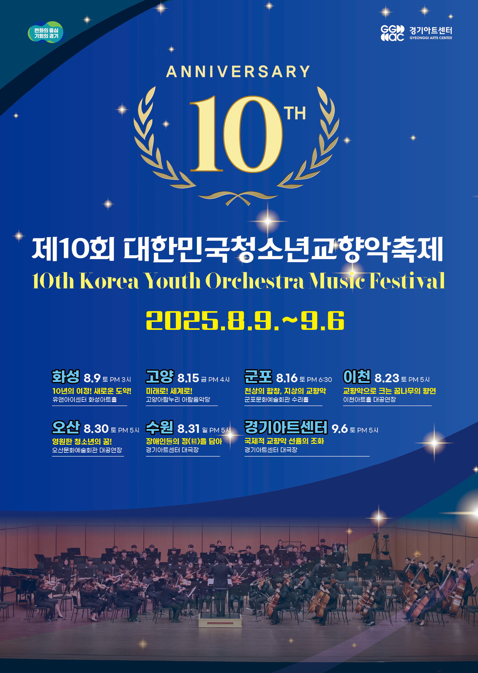 경기아트센터(사장 김상회)가 오는 8월 31일(일), 9월 6일(토) 이틀에 걸쳐 <제10회 대한민국 청소년교향악축제>를 개최한다. 대한민국 청소년교향악축제는 청소년을 위한 국내 최대의 클래식 축제로, 청소년 클래식 연주자들의 성장을 목표로 2016년 처음 개최되어, 지난해까지 약 2만 명이 넘는 청소년이 참여해 왔다. 올해는 경기도 내 7개 도시에서 국내외 31개 청소년 교향악단의 무대가 펼쳐지고 있다.