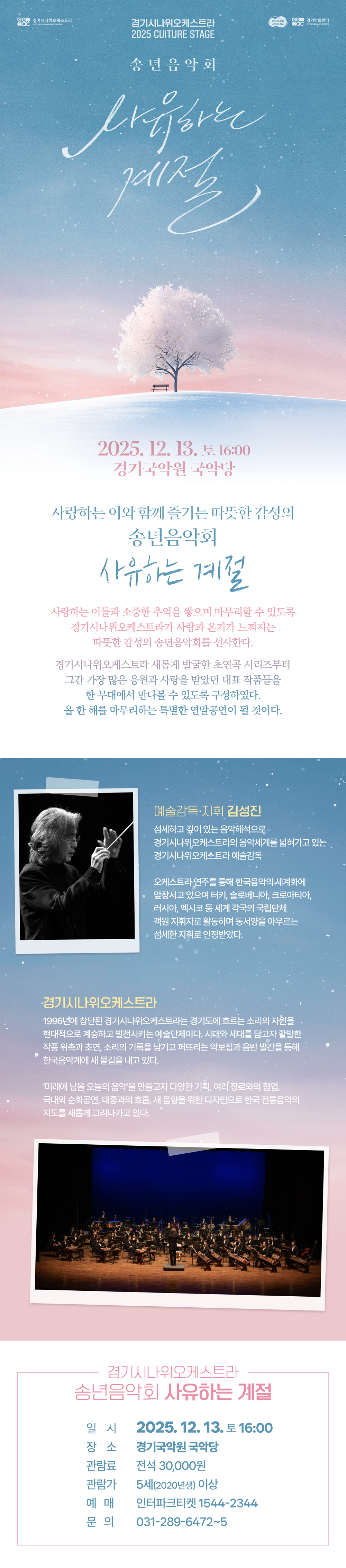 일정별 원간일정 예술단공연 경기시나위오케스트라 송년음악회 <사유하는 계절> - 용인 일자 2025-12-13 (토) ~ 2025-12-13 (토) 시간 2025-12-13 00:00 장소 국악당(용인), 기타 (경기국악원) 주최/주관 (재)경기아트센터 / (재)경기아트센터 관람연령 5세 이상 문의 031-289-6472~5 공유 공유하기 예매종료 상세정보 티켓정보 유의사항 리뷰 상세정보 티켓정보 유의사항 리뷰 아직 작성된 리뷰가 없습니다. 첫 리뷰 글을 작성해 보세요. 목록보기